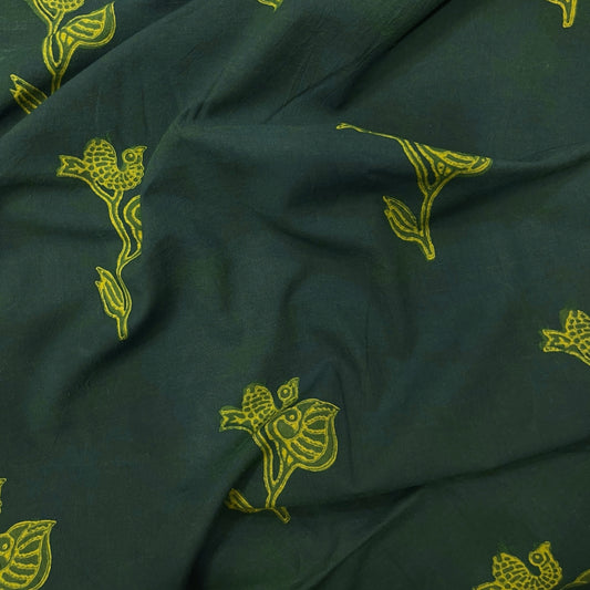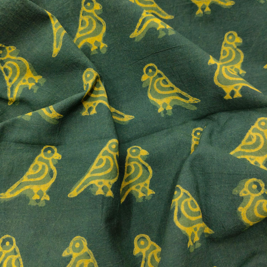 Dabu Green Bird Motif Hand Block Printed Fabric